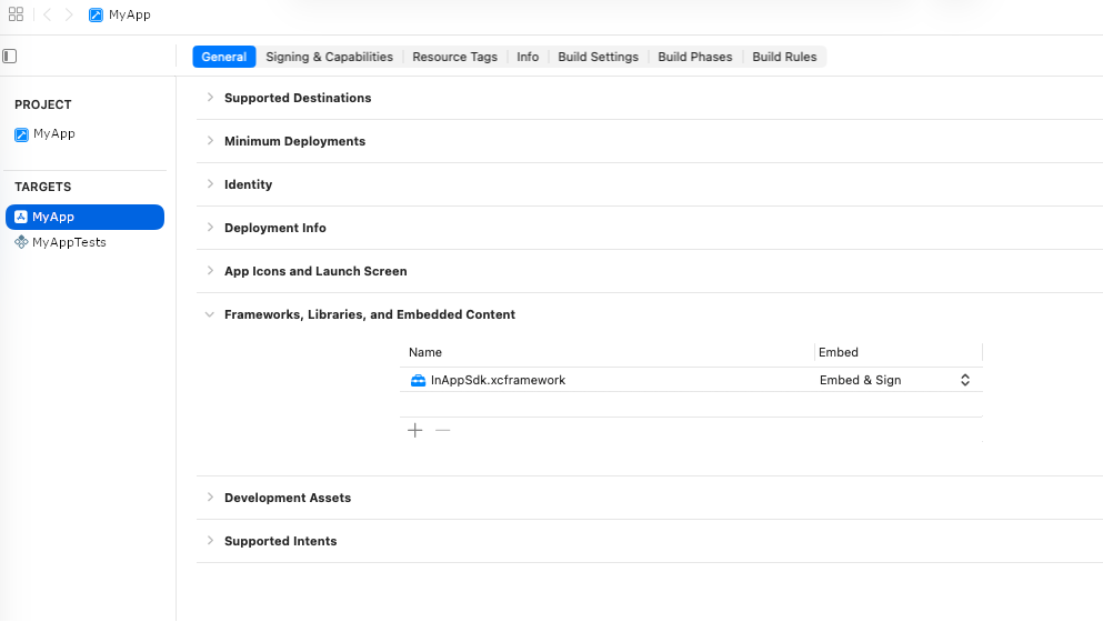 InAppSdk.xcframeworkin your project root folder. - In Xcode, open your project configuration (projet root)