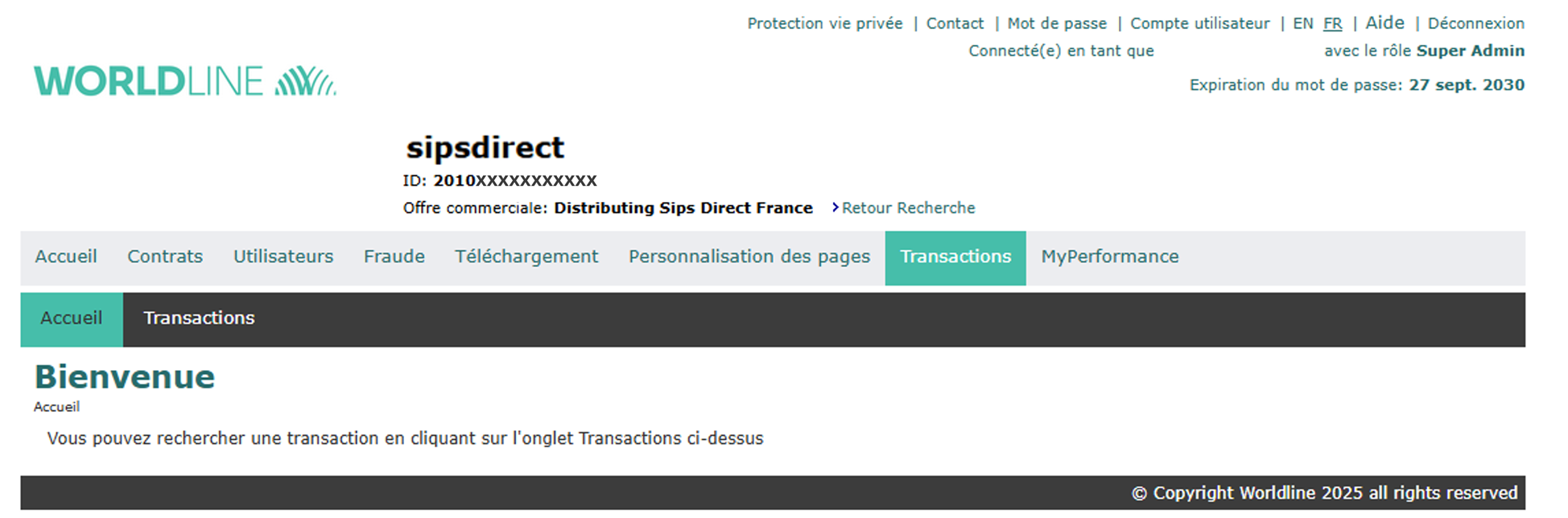 Les informations redondantes concernant l’identifiant du commerçant et le rôle de l’utilisateur sur la page d’accueil de SOE (onglet « Transactions ») ont été supprimées si l’utilisateur est sur un POS*. Ces informations restent visibles si l’utilisateur est sur un CG**.