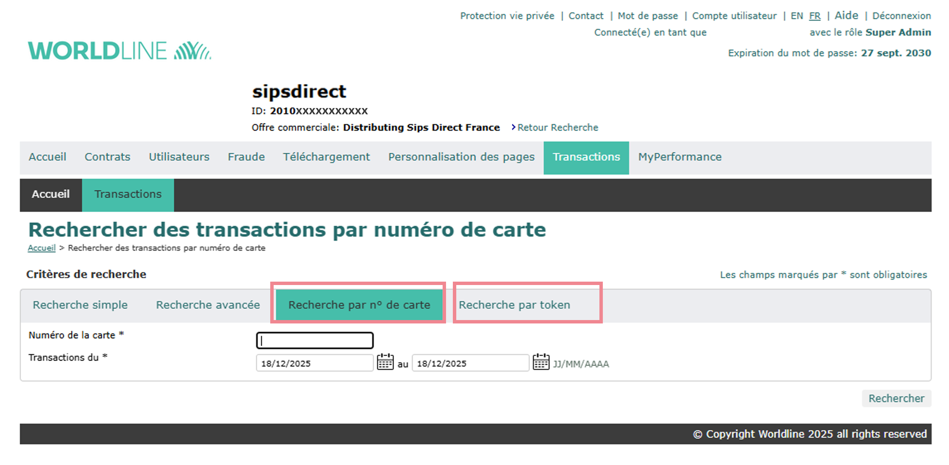 Les droits fins SOE « Recherche par Token » et « Recherche par n° de carte » ont été décorrélés. Aucun changement pour les utilisateurs déjà paramétrés qui gardent ces deux droits. Pour les nouveaux utilisateurs, le droit « Recherche par carte » devra être paramétré (auparavant, le droit « Recherche par Token » suffisait pour accéder aux deux fonctionnalités).